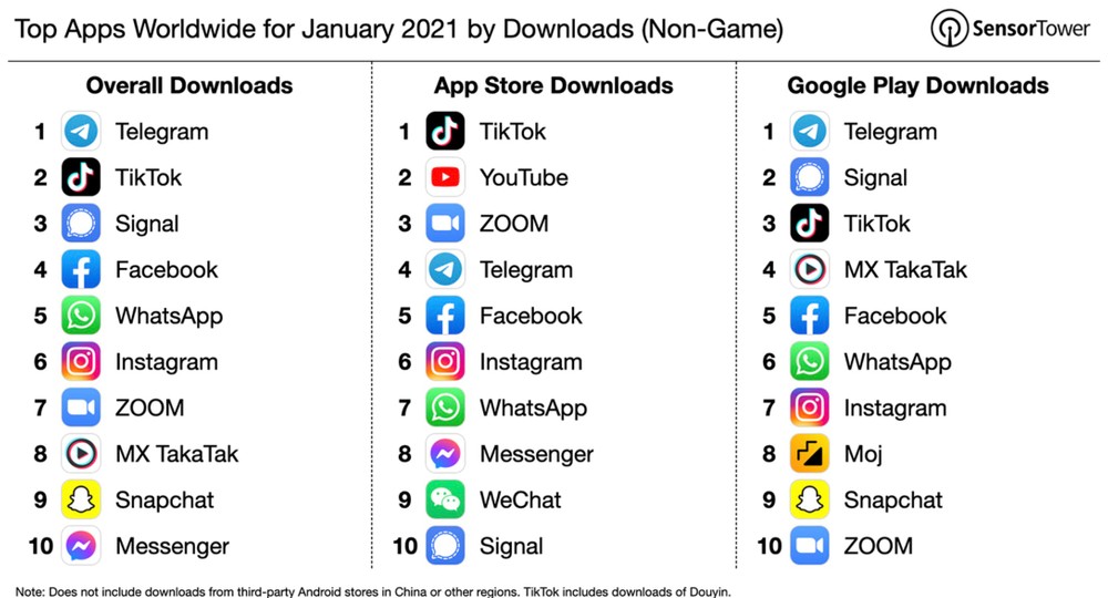 Telegram ha deciso di scavalcare definitivamente WhatsApp, andandosi a collocare al primo posto della classifica delle app (non game) più scaricate in tutto il mondo per quanto riguarda il mese di Gennaio. Il passo in avanti fatto rispetto a prima è decisamente evidente, anche perché prima WhatsApp era sopra a Telegram con un ottimo margine, ora nel giro di pochissimo tempo la situazione si è nettamente ribaltata. È quasi impossibile non tenere in considerazione la vicenda legata alla privacy, la quale ha portato gli utenti a preferire Telegram.