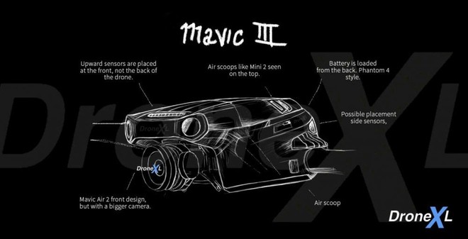 Dal disegno che vi riportiamo sopra, sembra che Mavic 3 possa essere il Drone perfetto. Sistema di chiusura ali mantenuto, ottima trasportabilità, sensore d’immagine e ottica molto più grande (sarebbe bello poterla anche sostituire come sui modelli professionali) e tanti elementi aerodinamici che sembrano indicare un miglior comportamento in volo, una gestione dei flussi d’aria ottimizzata (anche forse per raffreddare la batteria), e tanti sensori laterali e frontali che speriamo possano permettere al drone di “volare in autonomia” evitando gli ostacoli anche piccoli.