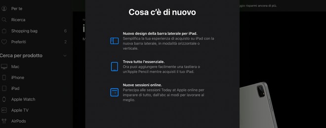 Cliccando sulla prima voce in alto, “acquista”, vengono mostrati una selezione degli ultimi prodotti Apple, tra cui i nuovi iMac, iPad Pro con M1 e iPhone 12 nella freschissima colorazione viola, oltre ai prodotti in evidenza e quelli specifici per i propri dispositivi. A fondo pagina è possibile trovare gli Apple Store fisici più vicini, mentre alla voce “calendario” possono essere visualizzate e prenotate le sessioni Today at Apple.